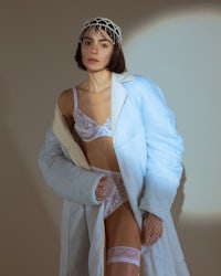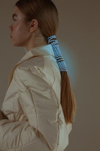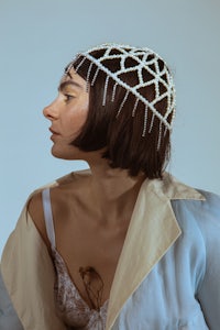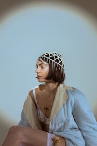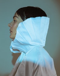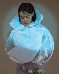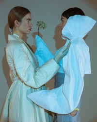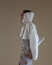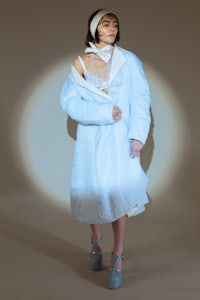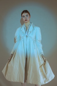 Outfit 03. Cappotto double ampio, con maniche a semicerchio raglan. Una face e in organza di cotone imbottita tinta a mano, mentre l’interno è in pelle d’uovo color écru. Presenta una cinta in vita, pieghe baciate frontali e sfondo piega posteriore.