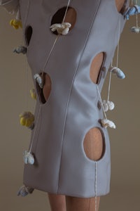 Gonna in similpelle traforata con fiori pendenti fatti e tinti a mano in cotone riciclato.