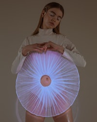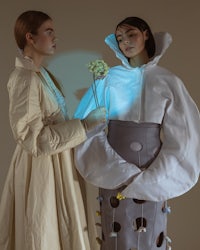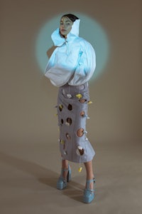 Outfit 02. Camicia a semicerchio in taffettà di seta foderata, con collo plissettato in forma.