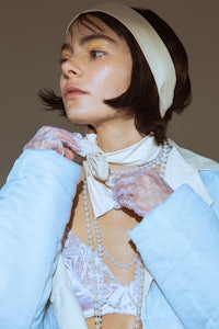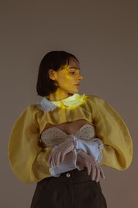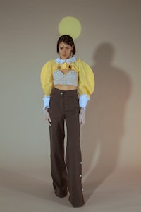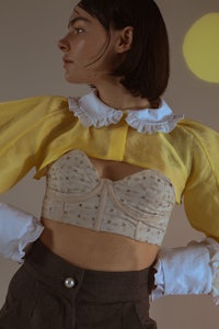 Outfit 04.Camicia cortissima bouble in organza di seta tinta a mano con tinture naturali. Colletto piatto in mussola di cotone con ruches, polsini alti in mussola, chiusura invisibile.