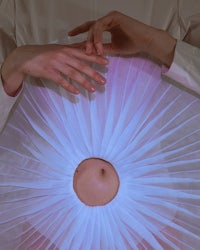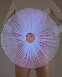 Buco sull’addome con ruota rimovibile di organza di cotone impunturata con pieghe baciate steccata con regilene.